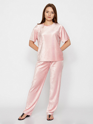 Костюм состоит из куртки и брюк. Куртка без застежки, с капюшоном и карманами в боковых швах. Рукава длинные, с манжетами по низу. Нижний срез куртки обработан притачным поясом. В край капюшона вставлен шнур. Перед куртки декорирован принтом. Брюки с манжетами и притачным поясом. В пояс вставлены резина и шнур.