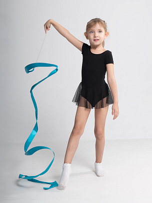 Купальник с длинным рукавом и с юбкой из сетки в цвет основного полотна. Вырез горловины и проймы ножек окантованы бейкой из основного полотна.