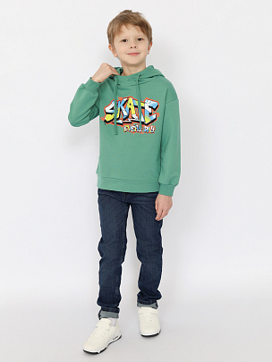Толстовка с длинными рукавами, притачным поясом и манжетами. Манжеты выполнены из полотна с добавлением лайкры, пояс выполнен из основного полотна. Капюшон со шнурком и подкладкой, верхняя часть декорирована вязаной нашивкой. Перед декорирован принтом "Катайся каждый день".