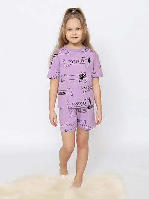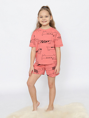 Комбинированная пижама из джемпера и брюк. Джемпер гладкокрашенный, свободного покроя с длинным рукавом. Горловина обработана притачной бейкой из рибаны с лайкрой. Перед оформлен принтом. Прямые брюки умеренного объёма выполнены из набивного полотна. Цельнокроенный пояс обработан плоским швом вподгибку с одновременным прокладыванием резинки.