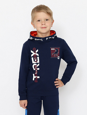 Толстовка для мальчика с капюшоном со шнурком, карман-кенгуру. Манжеты и пояс из эластичной рибаны. На рукаве декоративная силиконовая нашивка.