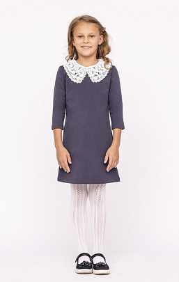 Платье для девочки из футера. Изделие с длинными рукавами, отложным съемным воротником из кружева. Отрезное чуть ниже линии талии. Сзади застегивается на пуговку. Декорировано бантиком.