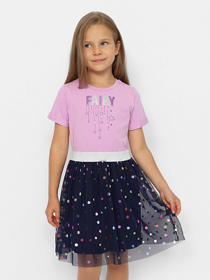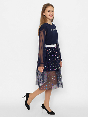 Нарядная двухслойная юбка для девочки из сетки с блестящими кружочками "конфетти". Эластичный пояс с люрексом. Подкладка выполнена из хлопкового трикотажа. Подкладка короче верхнего слоя сетки.