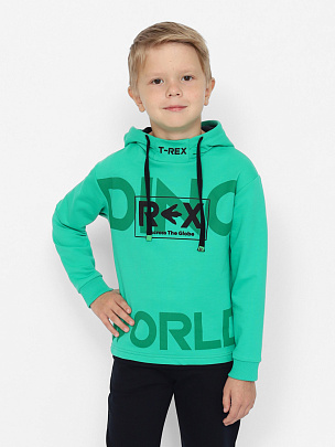 Толстовка для мальчика с капюшоном и карманами в боковых швах. Манжеты и пояс из эластичной рибаны. Внизу на полочке декоративная силиконовая нашивка.