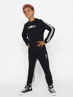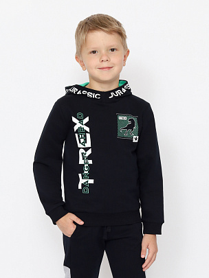 Толстовка с длинными втачными рукавами и манжетами из полотна с добавлением эластана. В нижней части толстовки расположена декоративная планка контрастного цвета. Капюшон с лицевой частью и декоративным принтом, шнурок декорирован вязаной нашивкой. Перед декорирован принтом "Панно" мир динозавров. Брюки с притачным поясом, манжетами и функциональными карманами. Пояс и манжеты выполнены из полотна с эластаном.