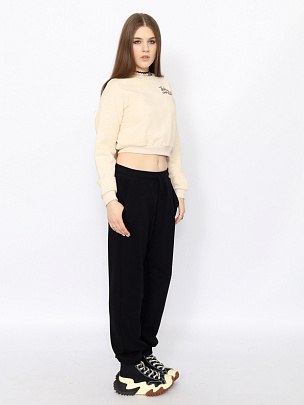 Свободные трикотажные брюки с карманами. В притачной пояс вставлена резинка и функциональный шнур. Нижние срезы брюк оформлены манжетами.