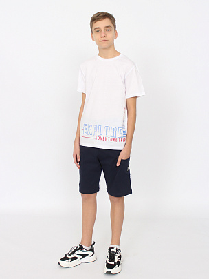 Футболка с коротким рукавом. Горловина круглая, обработана узким воротником из полотна с эластаном. Перед оформлен шрифтовым принтом.