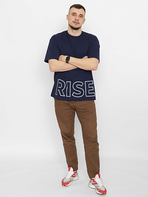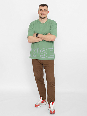 Футболка oversize со спущенным плечом, с коротким рукавом. Горловина круглая, обработана притачной бейкой из рибаны с лакрой. Плечевые швы смещены на перед и отстрочены. Перед оформлен принтом.