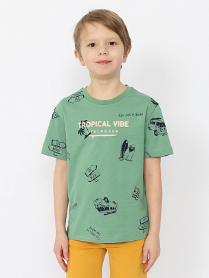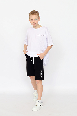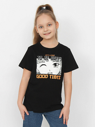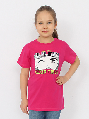 Футболка прямого силуэта с короткими рукавами. Горловина круглая, обработана притачной бейкой из рибаны с лайкрой. Перед футболки декорирован принтом с использованием глиттера.
