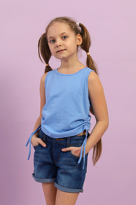 Футболка прямого силуэта с короткими рукавами. Горловина круглая, обработана притачной бейкой из рибаны с лайкрой. Перед футболки декорирован принтом с использованием глиттера.